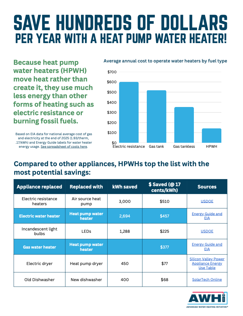 Our helpful factsheet can give you an idea of the potential utility bill savings of switching to a HPWH