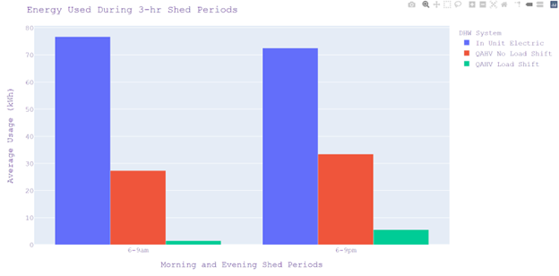 This chart shows the potential for demand response in heat pump water heaters. The blue bar shows energy usage by electric resistance water heaters during peak demand, the red bar shows energy usage by central heat pump water heaters and the green bar shows energy usage by central systems with demand response. Image courtesy of Ecotope.